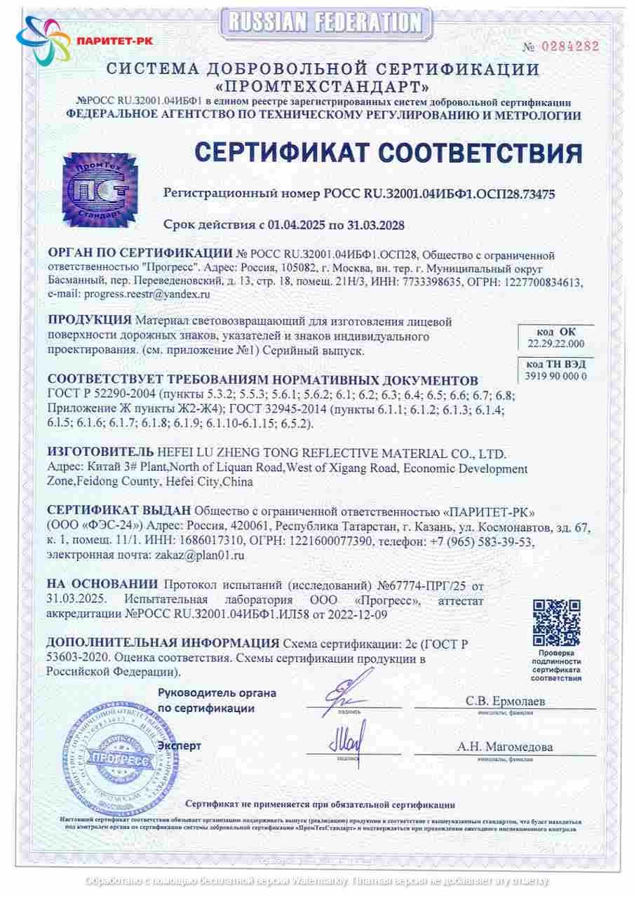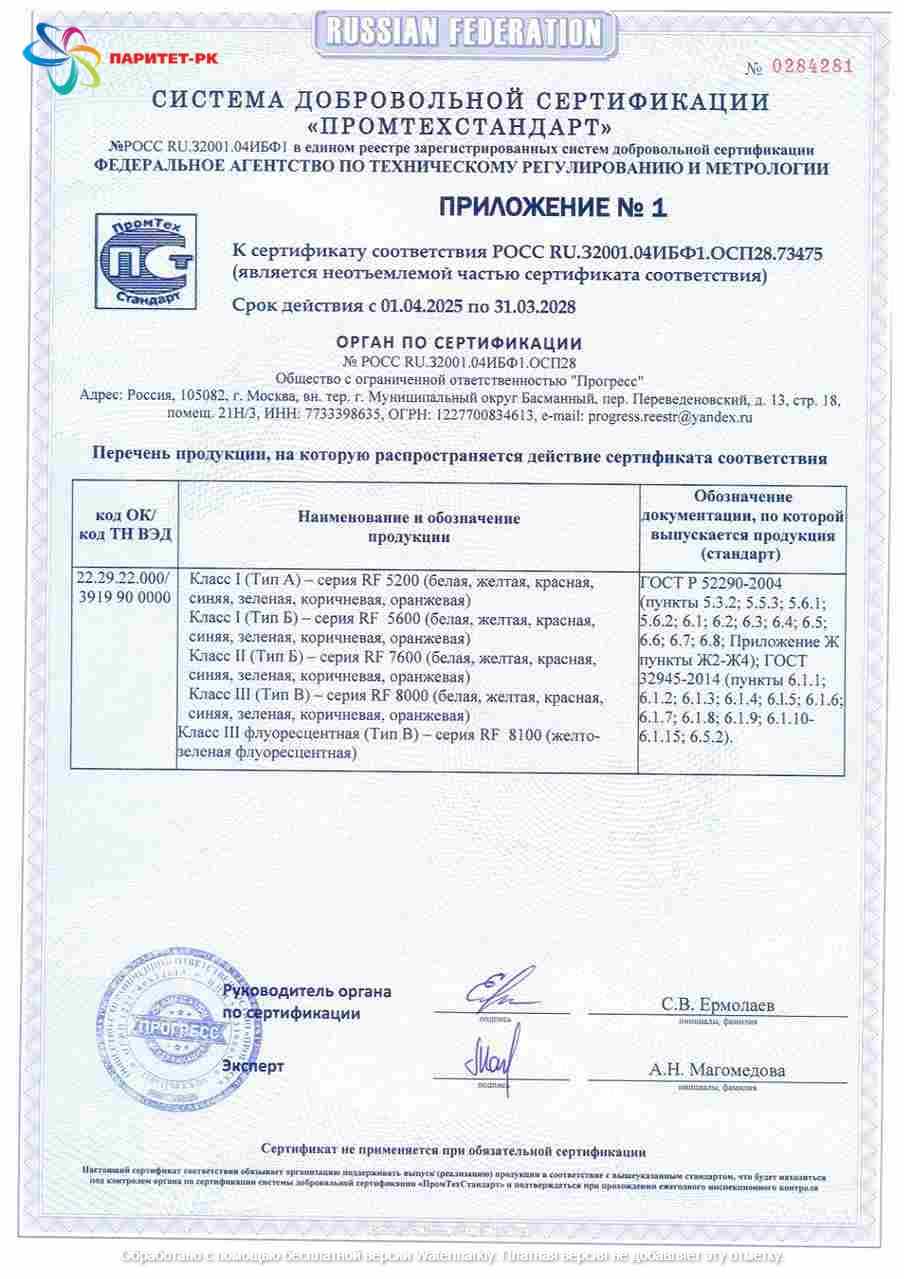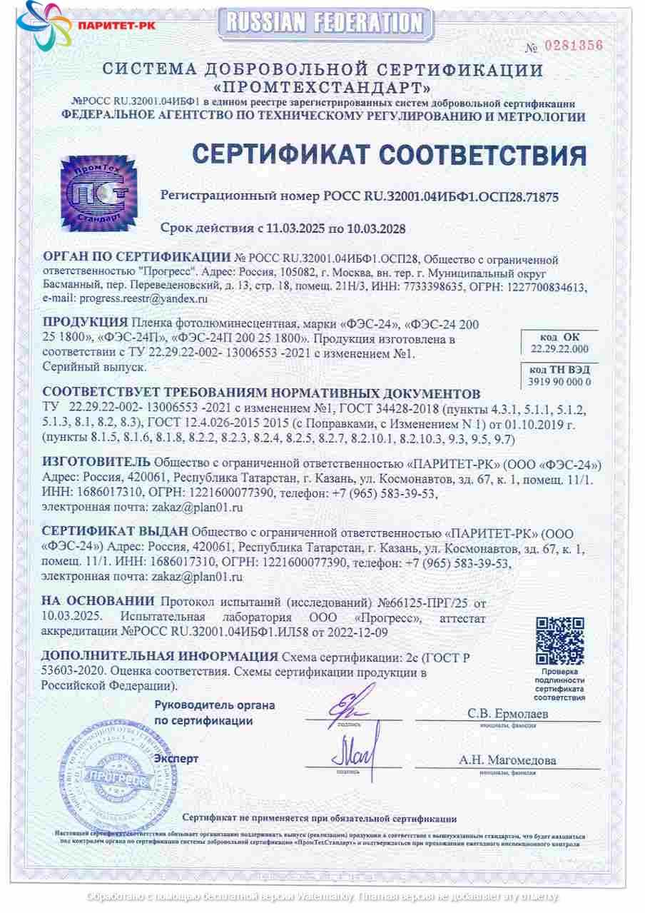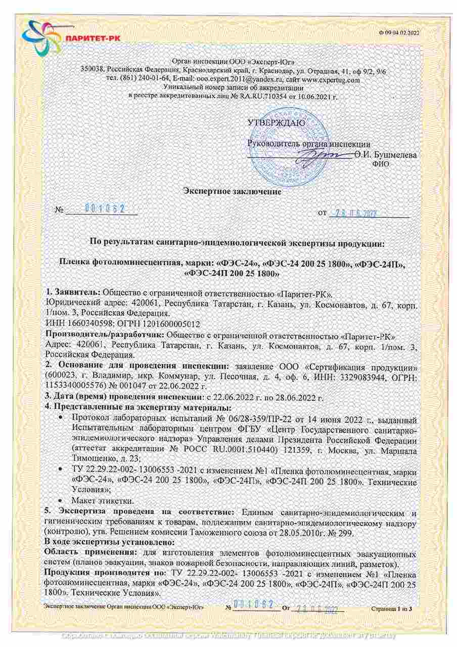 ООО "Паритет-РК" с 2012 года успешно работает на российском рынке фотолюминесцентной пленки, занимая лидирующие позиции. Мы предоставляем продукцию, соответствующую стандартам ГОСТ 12.4.026-2015 с изменением №1 от 01.10.2019 г. и ГОСТ 34428-2018, что подтверждается сертификатами безопасности.